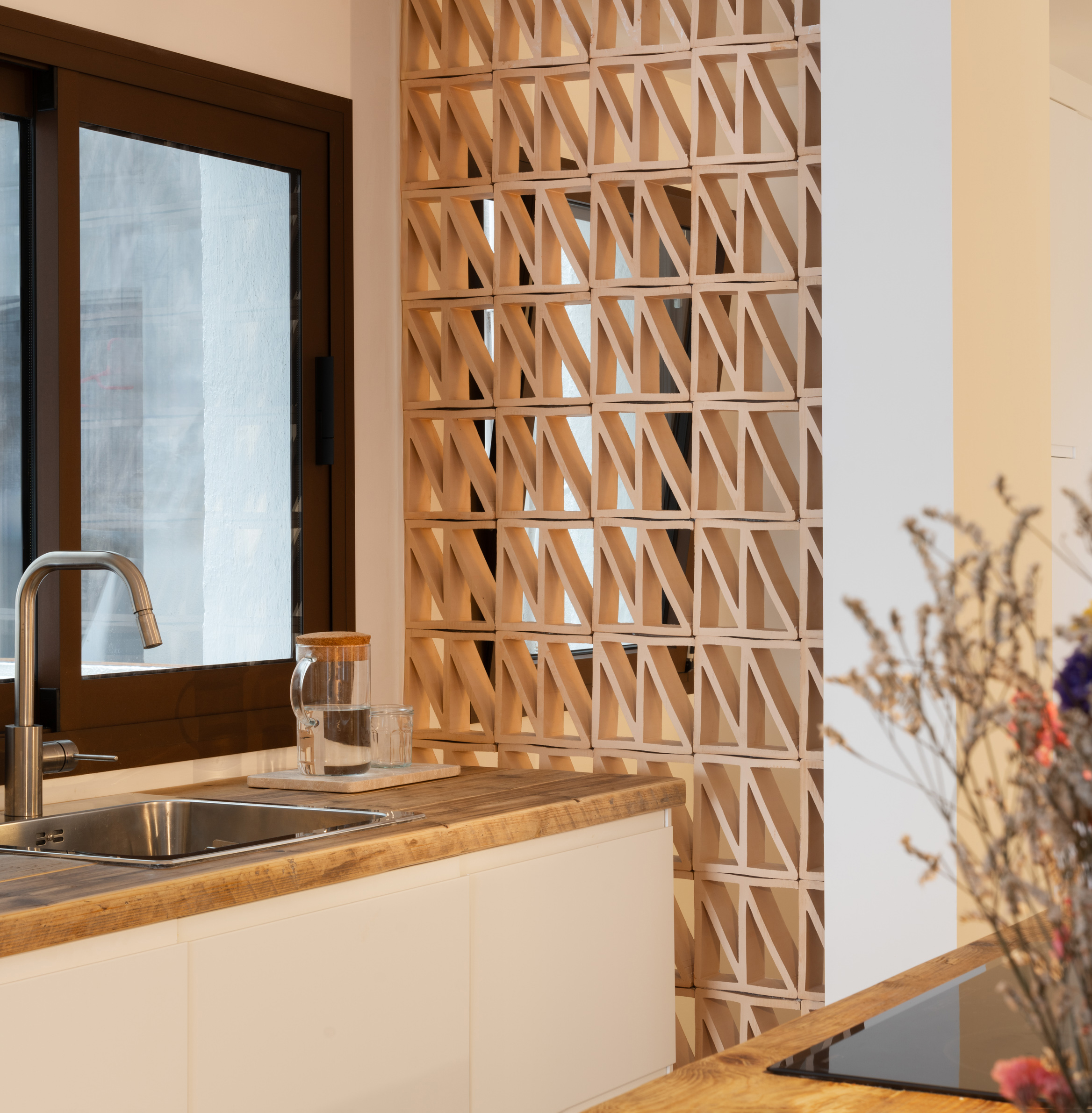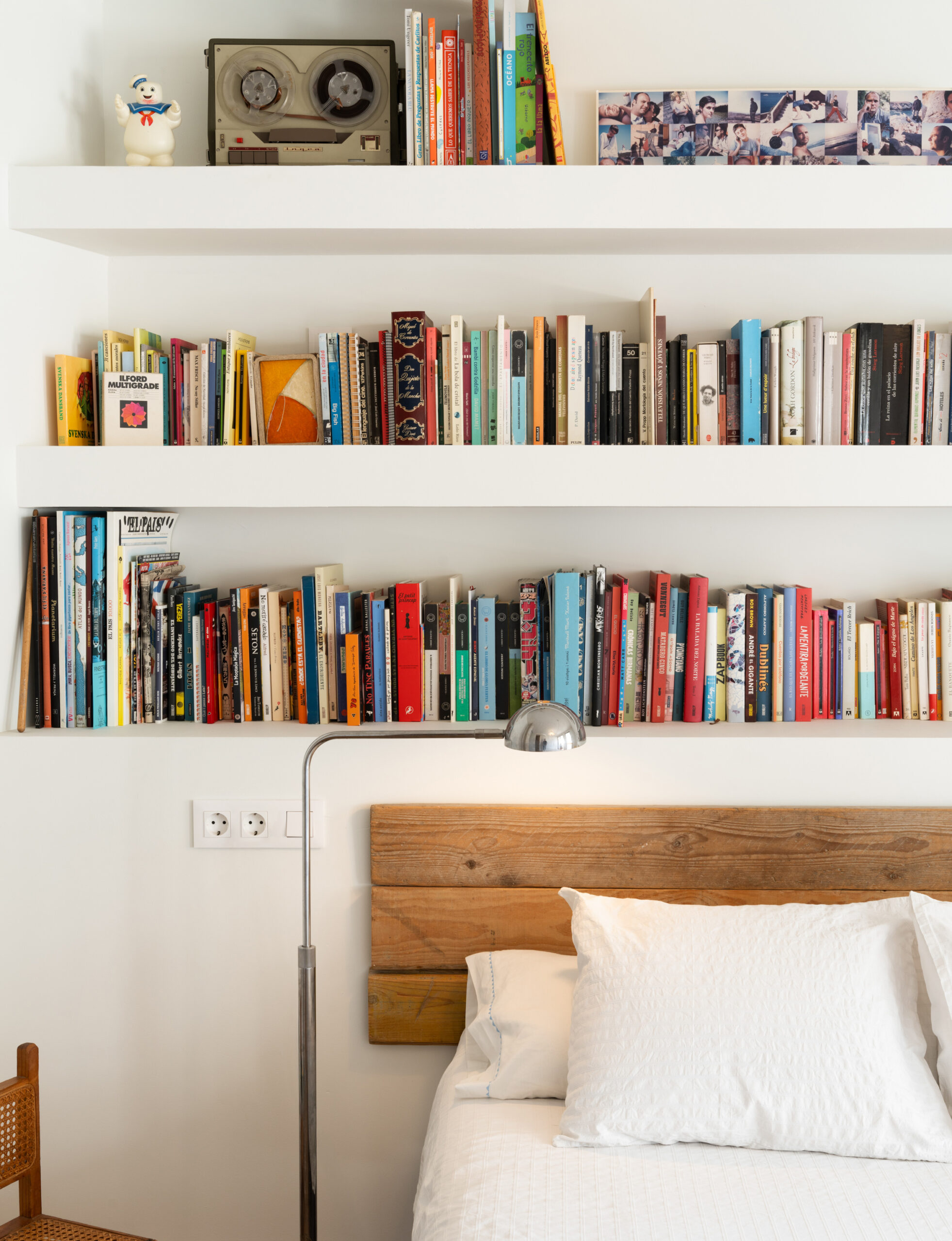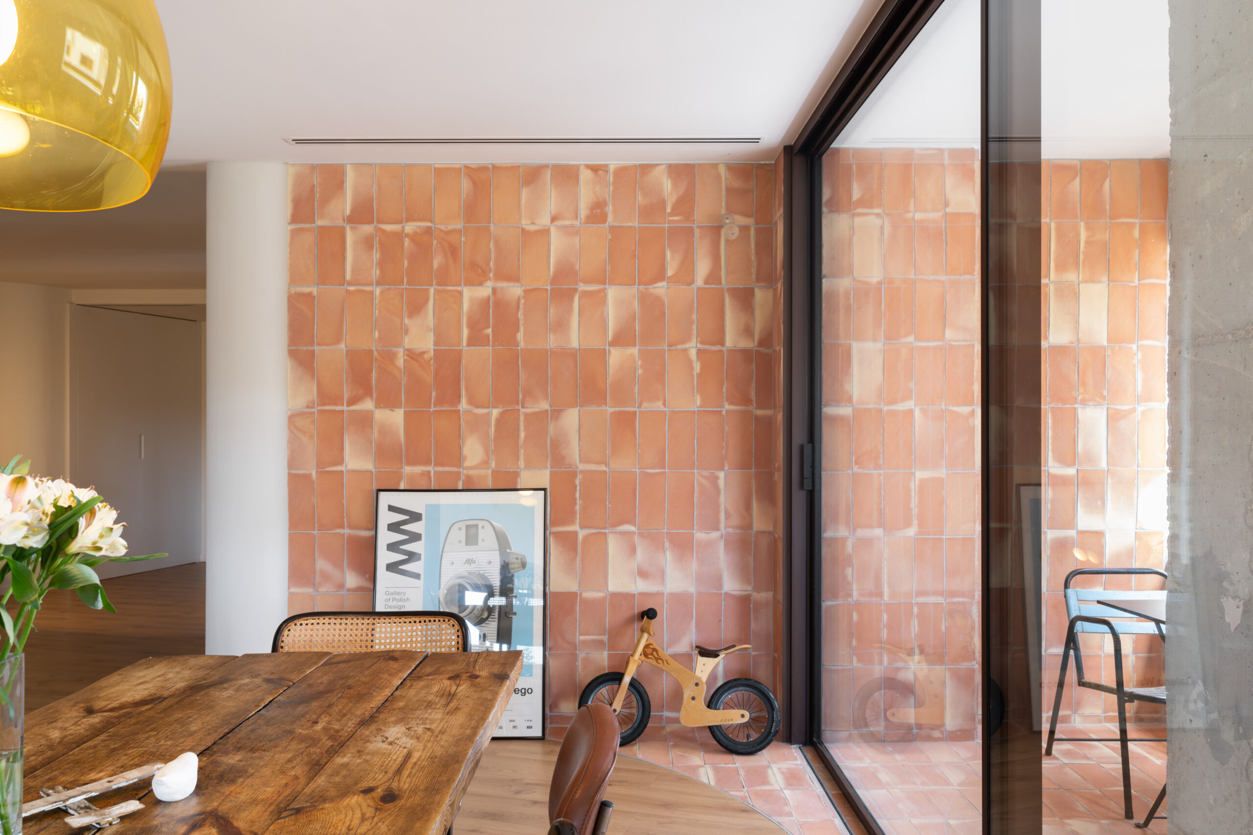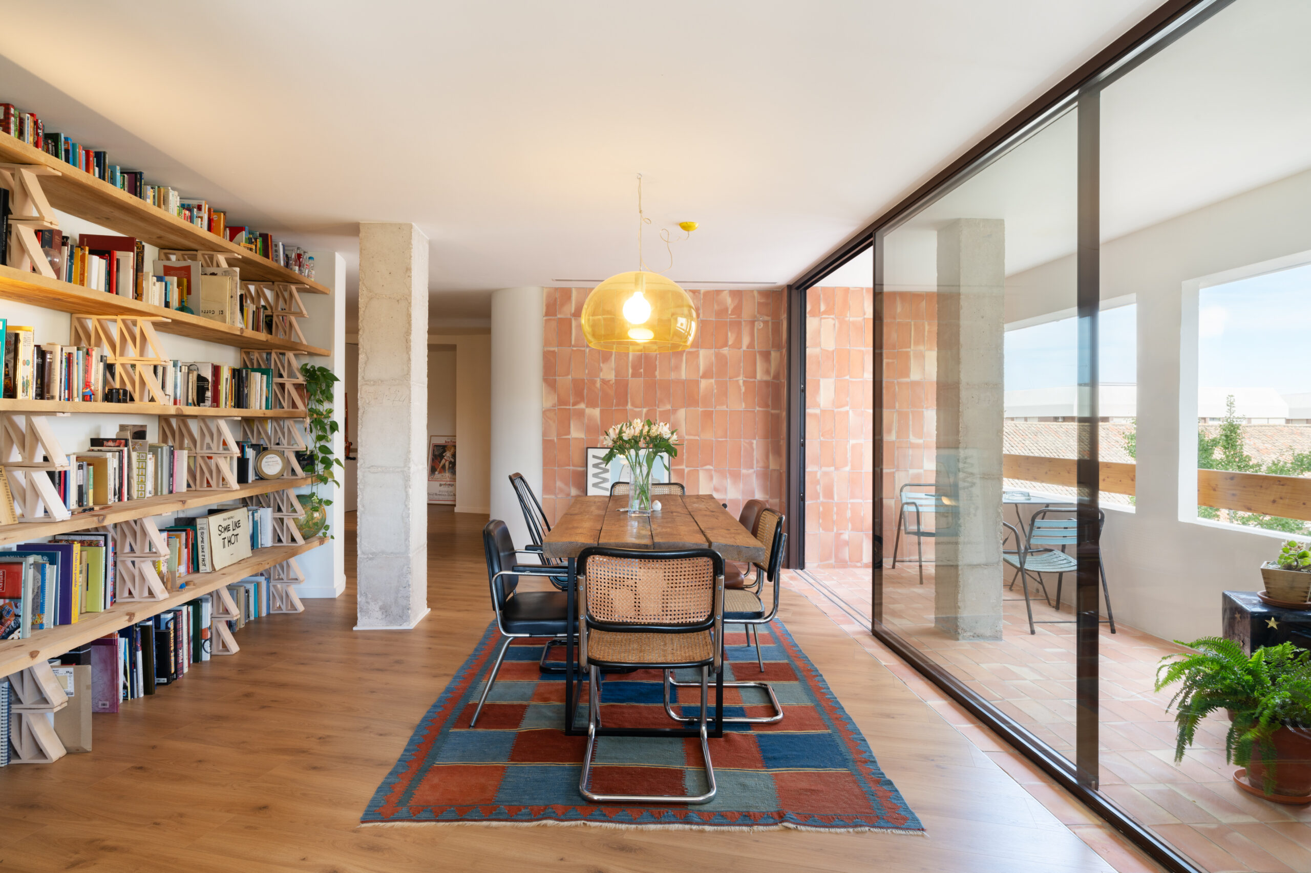 Los clientes, apasionados por la decoración y el diseño interior, buscaban una vivienda que no fuera un simple contenedor, sino un soporte activo para su modo de habitar. El proyecto responde con una distribución clara y generosa, donde las estancias se conectan visual y espacialmente, permitiendo una lectura continua del espacio. Las piezas de mobiliario —entre las que destacan sillas y aparadores de inspiración midcentury, lámparas de vidrio soplado y estanterías de madera hechas a medida— no son accesorios, sino protagonistas de la escena doméstica. Cada elemento ha sido elegido con atención, conformando un entorno donde lo cotidiano se transforma en experiencia estética.