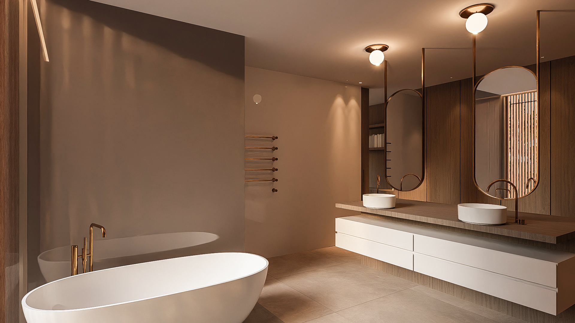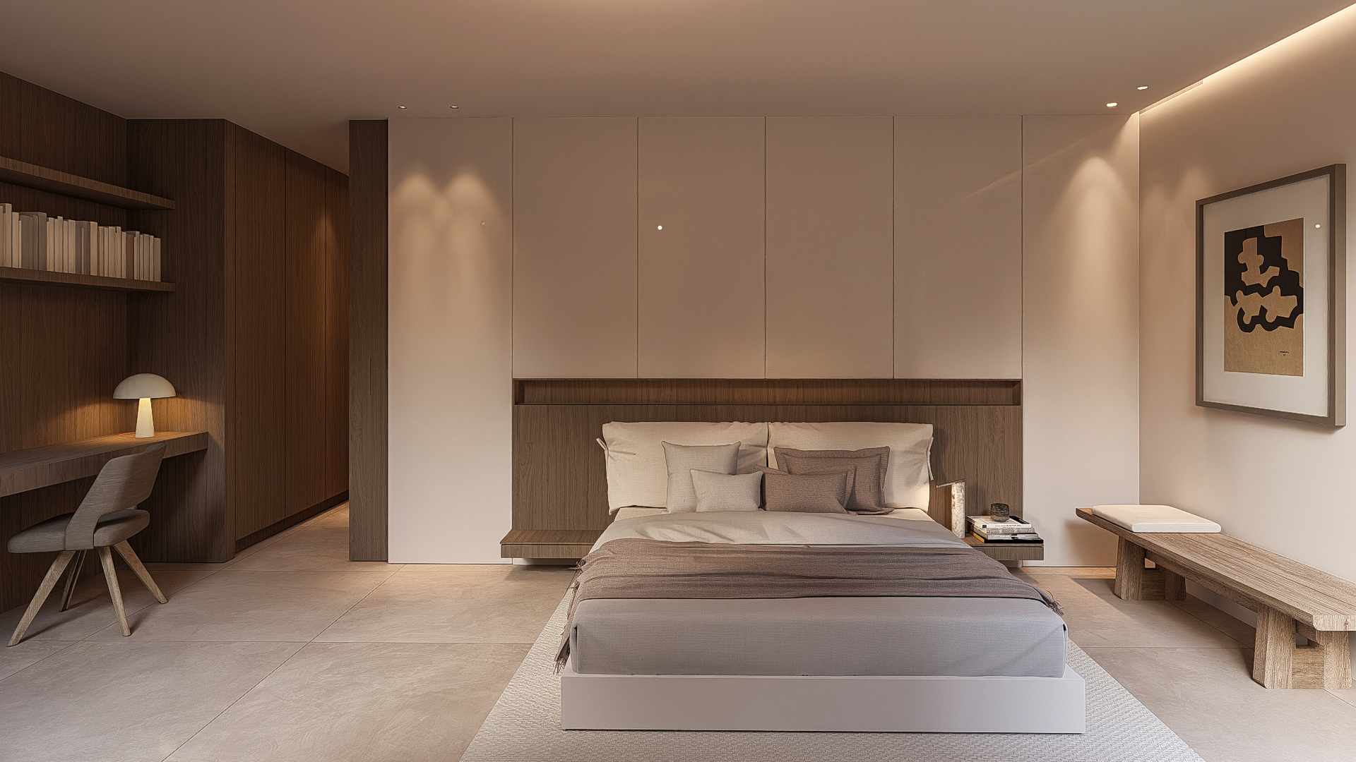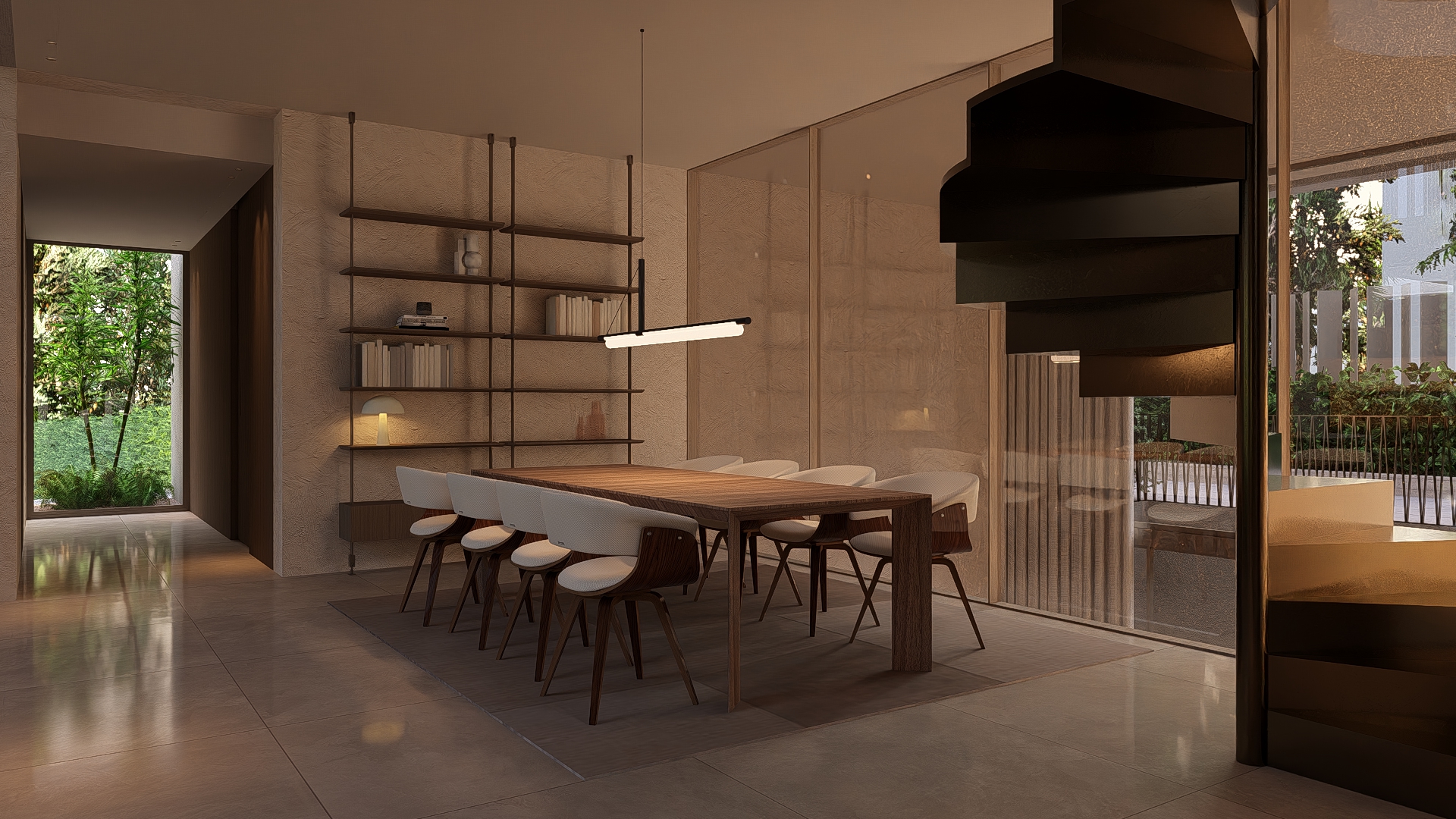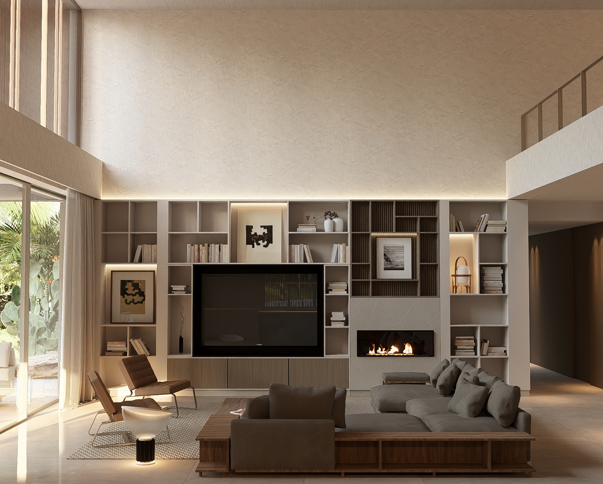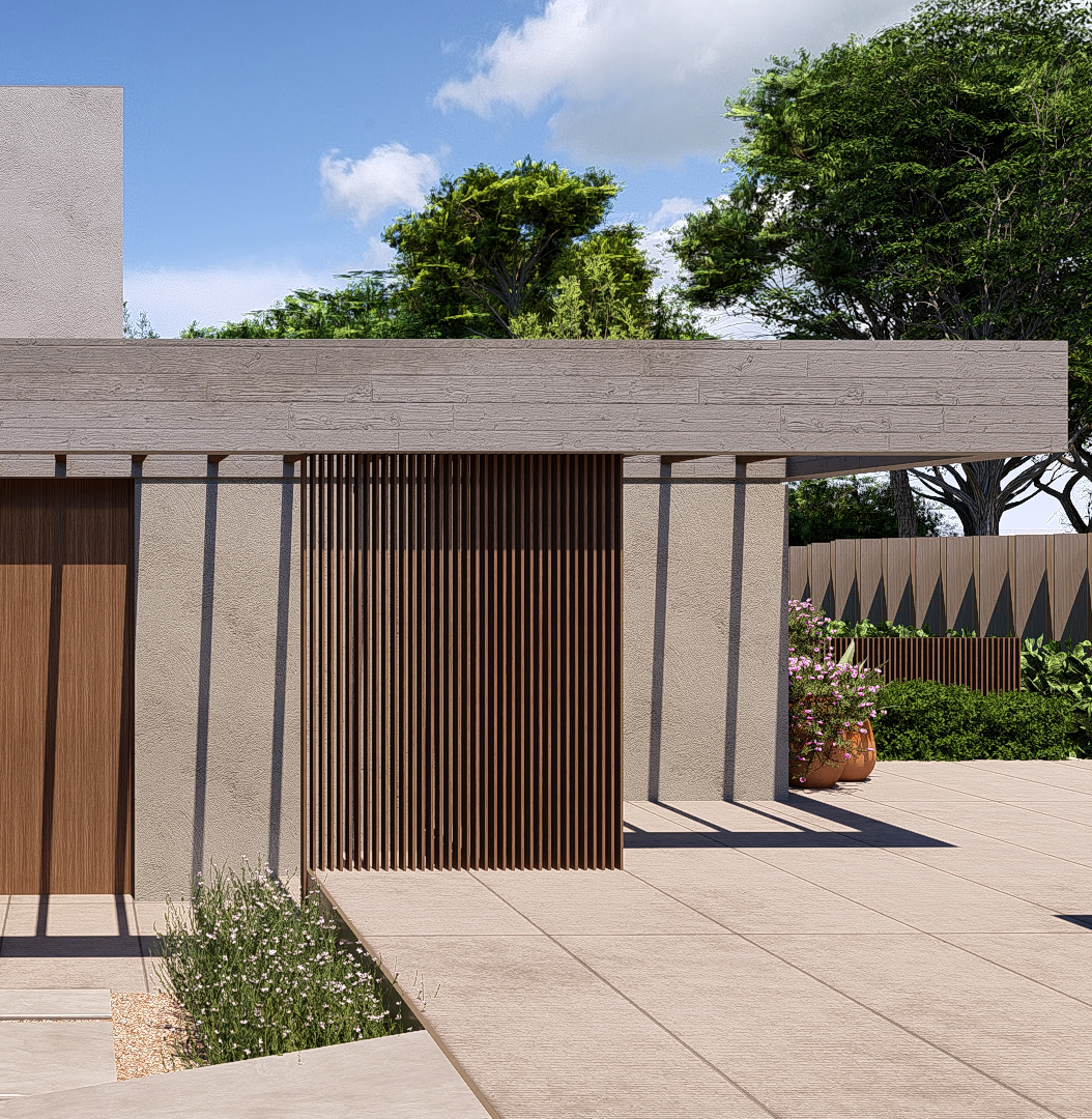 Los acabados en tonos piedra aportan una materialidad calmada y mineral, anclando la vivienda al lugar. En contraste, las lamas verticales de madera en los huecos introducen calidez, ritmo y filtro solar. Esta doble piel — sólida y texturada, cálida y modulada— permite que la vivienda respire con coherencia y profundidad. La madera, al tiempo que tamiza la luz, actúa como interfaz entre el interior doméstico y el exterior natural, otorgando privacidad sin renunciar a la apertura.