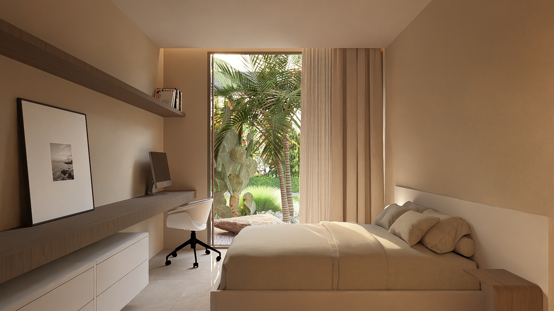 Surge una arquitectura contenida y esencial, en la que la estructura no se oculta, sino que se convierte en protagonista. La gran viga perimetral de hormigón dibuja con precisión los límites del proyecto, marcando con firmeza la geometría de la vivienda y otorgándole un carácter tectónico y sereno.