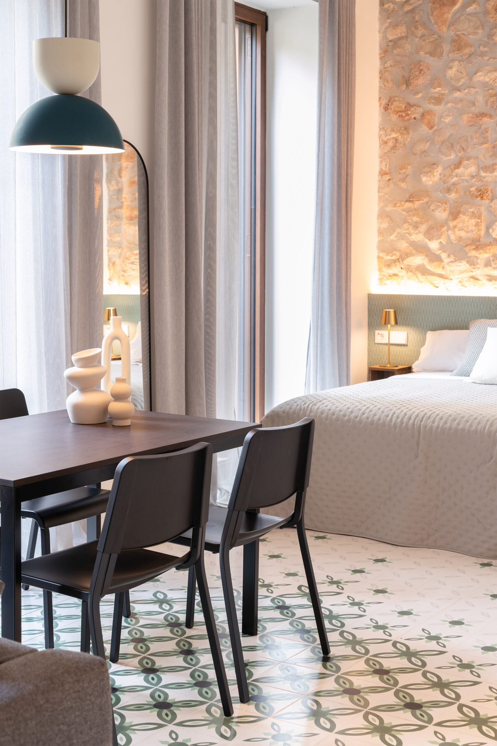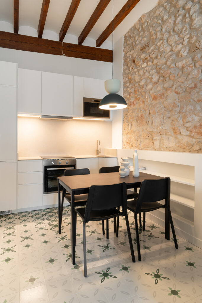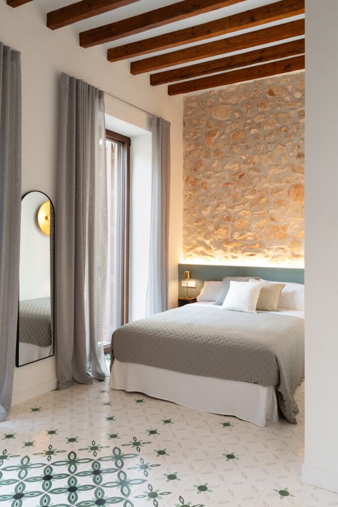Se recuperan materiales existentes como los muros de piedra, que aportan textura y autenticidad, y se combinan con nuevos acabados sobrios y luminosos. La cerámica hidráulica de inspiración clásica recorre el suelo, aportando ritmo y color, mientras los techos con vigas de madera expuesta refuerzan la identidad mediterránea de los espacios, creando una envolvente que conecta pasado y presente.
