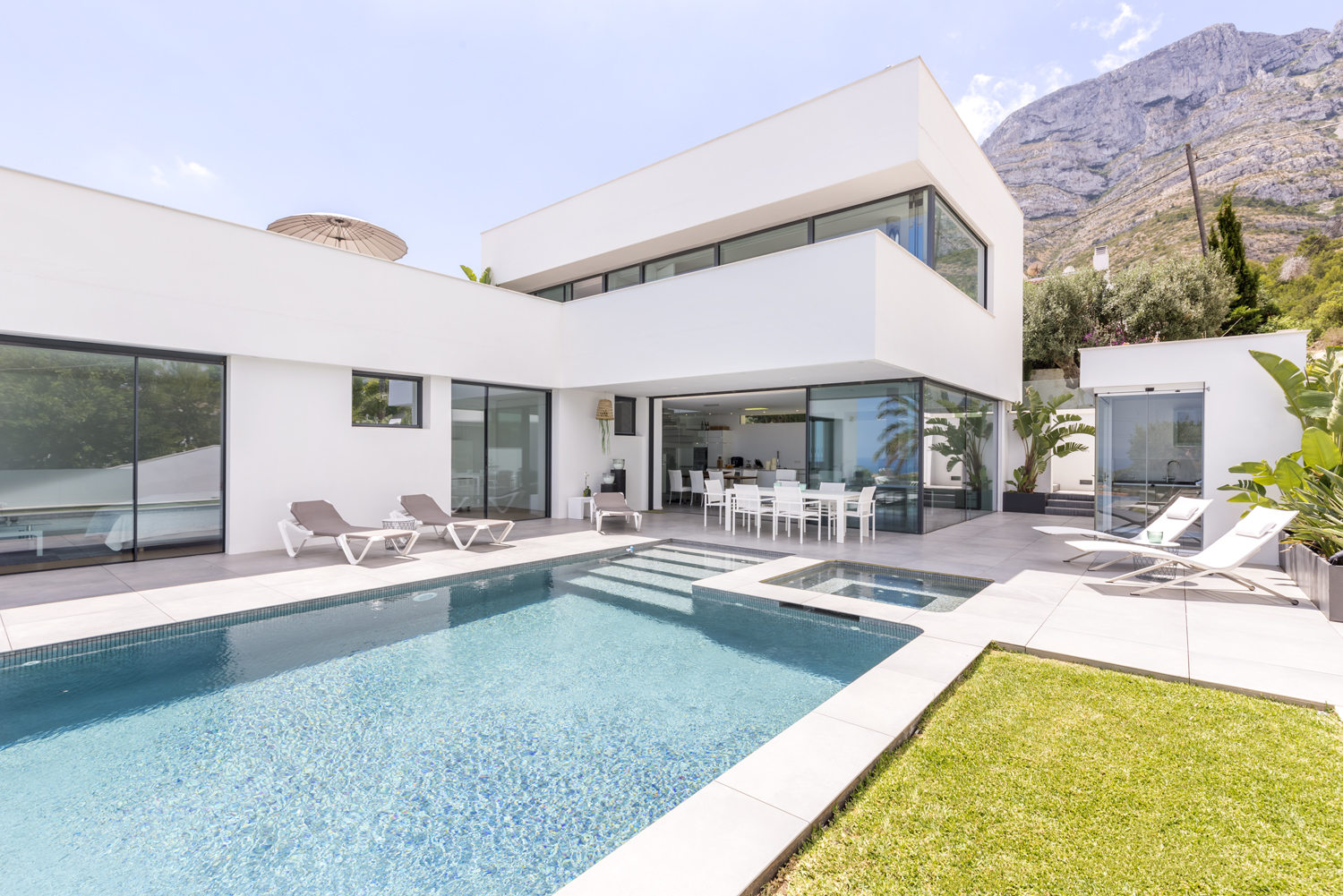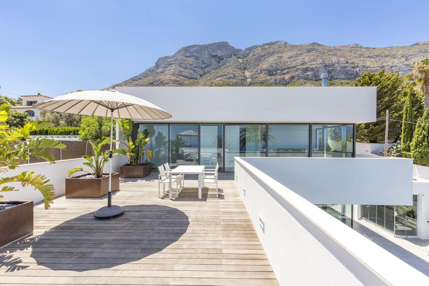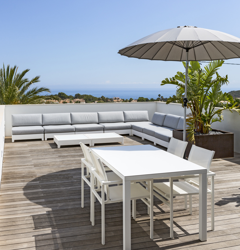 Esta vivienda se construyó en una parcela que gozaba de unas vistas espectaculares pero que estaba muy expuesta a las casas colindantes. Los propietarios nos pidieron mantener la privacidad de las zonas comunes de cara al exterior. Con ese objetivo planteamos un diseño en «L» que se abre al mar y a la ladera de la montaña, pero se cierra a los ojos de los vecinos.