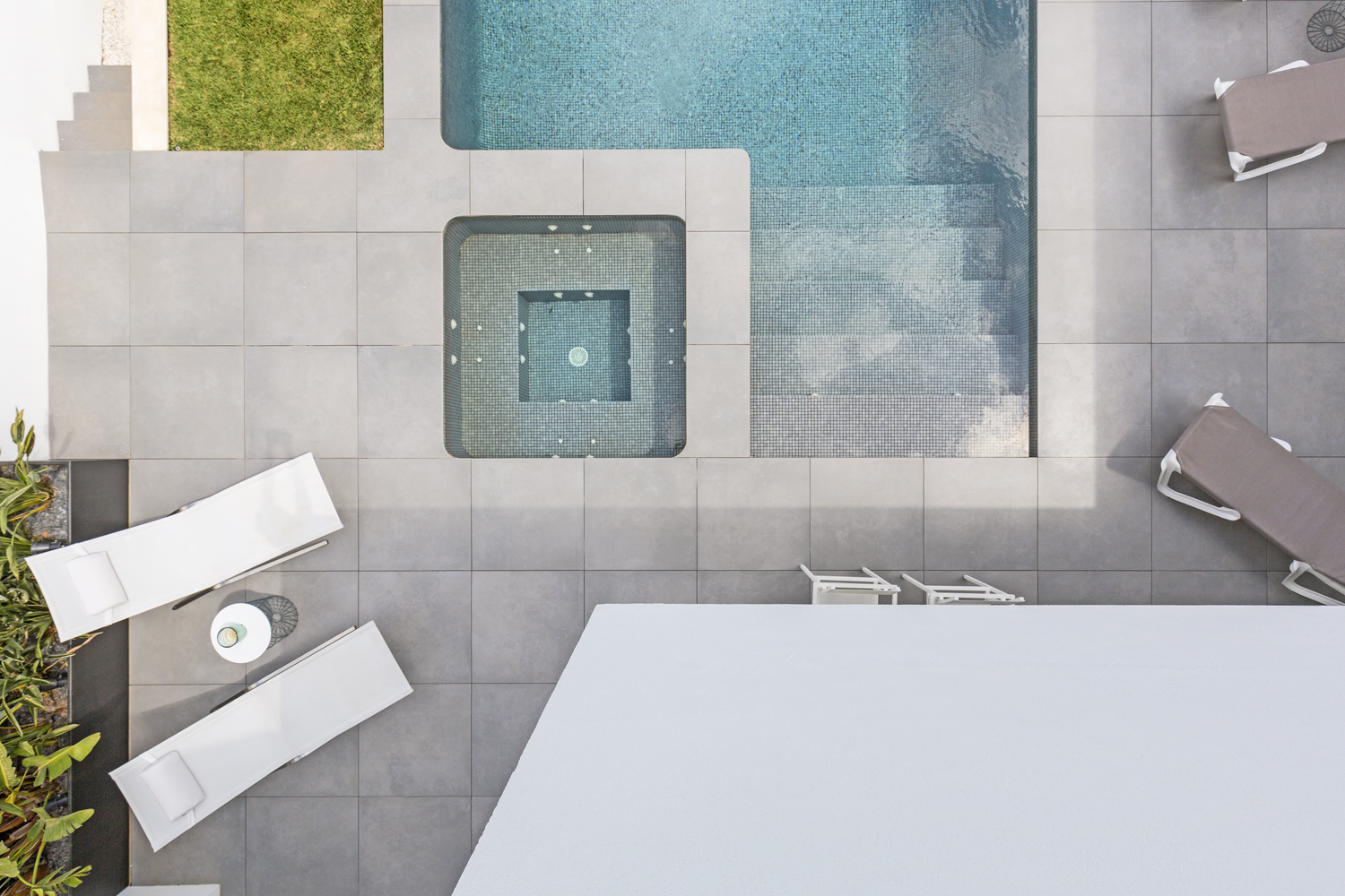 Se crea una fachada posterior cerrada para mantener la privacidad. Este hermetismo se rompe con la disposición de una serie de patios ingleses, que actúan como pequeños oasis de luz. Por otro lado, la fachada frontal con la introducción de elementos móviles—cristaleras plegables—se abre y cierra al paisaje potenciando el uso de los espacios con vistas al mar.